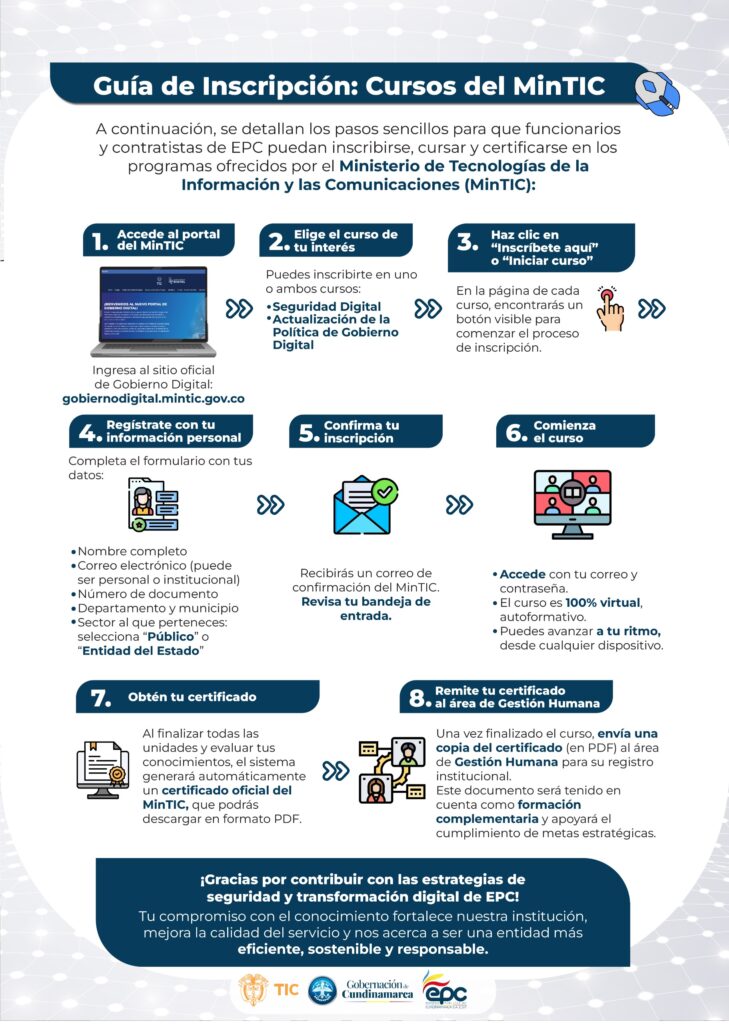 Como parte del compromiso de Empresas Públicas de Cundinamarca (EPC) con la excelencia en la gestión pública, se está promoviendo la participación del talento humano en cursos gratuitos del MinTIC sobre Seguridad Digital y Actualización de la Política de Gobierno Digital.